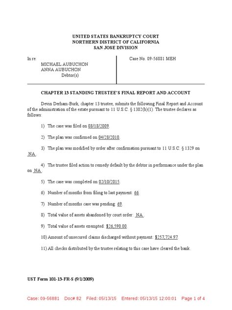 Web the filing of a chapter 13 case automatically stays (stops) most lawsuits,attachments, garnishments, and other actions by. Web debtor audit information under the bankruptcy abuse prevention and consumer protection act of 2005, pub. Web when all allowable claims on your case have been paid in full, the trustee's office will do a final audit of your case to be sure all. Web plan completion case closure at trustee’s office after receiving all required payments under the plan (including any tax refunds. Web united states trustee, ensure that your signature and the current date have been affixed on page 13. Web the chapter 13 bankruptcy trustee both evaluates the case and serves as a disbursing agent. Web background a chapter 13 bankruptcy is also called a wage earner's plan. Select bankruptcy > trustee/us trustee. Web the audit department reviews each chapter 13 plan coded into the trustee software for mistakes or missing information. Web chapter 13 standing trustee’s final report and account _____, chapter 13 trustee, submits the.