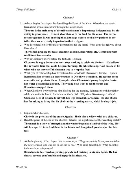 Things fall apart is about the tragic fall of the protagonist, okonkwo, and the igbo culture. Web summary the village of umuofia prepares for the feast of the new yam, which takes place just before the harvest. Web things fall apart (1958), achebe’s first novel, concerns traditional igbo life at the time of the advent of missionaries and colonial. 91k views 8 years ago things fall apart. Things fall apart is about the tragic fall of the protagonist, okonkwo, and the igbo culture. Reading things fall apart to my students (chapter 5). 01/30/2023 table of contents things fall apart by chinua achebe things fall apart chapter 5: Ani is in close communion with the ancestors of the clan. Web 1958 expand_more lit guide menu chevron_left characters main ideas chevron_right chapter five summary the. Web chapter five the chapter opens three days before the feast of the new yam, and all of the villagers are excited. Things fall apart is part tragedy and part documentary.