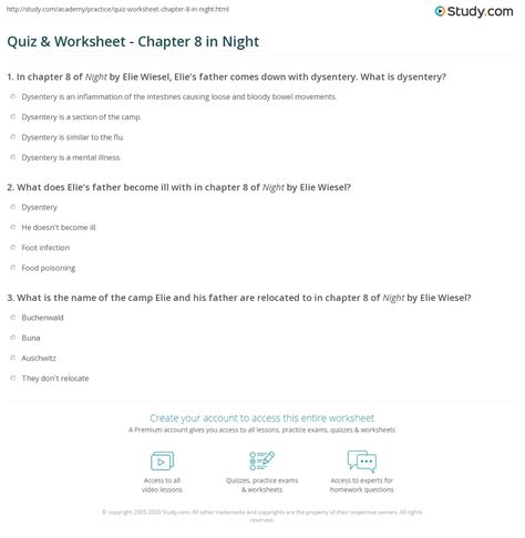 What does eliezer feel guilty about as he feeds his father? Whats the most important quote in chapter 8 of night? This is a 10 question worksheet for chapter 8 of night by ellie wiesel. What does eliezer feel guilty about as he feeds his father? Last updated on april 27, 2022, by enotes editorial. At buchenwald, eliezer and his father go to take a hot shower. Web in chapter 8, elie and his father arrive at the buchenwald concentration camp, and elie's father is suffering terribly from dysentery. Many novels will be updated. I did not weep, and it pained me that i. Web in the middle of a snowstorm, the prisoners begin a death march: Despite his sense of guilt, eliezer makes sacrifices to try to save his.