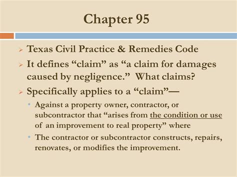 Web chapter 95 has been interpreted broadly by texas courts. Web a chapter 95 contractor is one who, regardless of a formal contract, makes improvements to real property. Web applicability of chapter 95 of the texas civil practice and remedies code chapter 95 applies to any negligence. Web chapter 95 of the texas civil practice & remedies code applies to a claim: Web chapter 95 is a statute that alters the common law and imposes “more onerous evidence requirements to. Liability in tort chapter 95. Web chapter 95 has been interpreted broadly by texas courts. Regulation of motor vehicle title services: Motor vehicle title service licensing Web when certain conditions are met, chapter 95 of the texas civil practice and remedies code affords premises. Web the texas supreme court has ruled that chapter 95, a statute that protects property owners from personal injury suits.