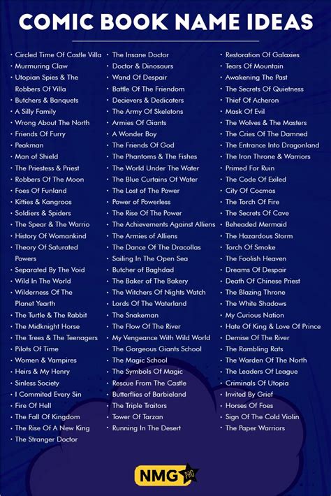 Comic Name Ideas. These are some good comic book names ideas to inspire you:. Web as you brainstorm a name, consider employing these methods to inject a little fun into it: