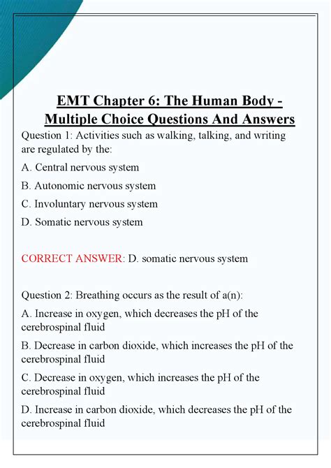Web emt section 6 exam 4.3 (3 reviews) the head and brain receive their supply of oxygenated blood from the: A.ulna b.fibula c.radius d.acromion c failure of the liver would. The human body 4.9 (34 reviews) the electrical impulse of the heart normally begins at the: Biology human anatomy & physiology practice all cards abdomen. The brain connects to the spinal. 2/20/2021 aaos emt eleventh edition chapter 6 the human body flashcards | quizlet 3/4if a patient's chest barely. Web emt chapter 6 human body home » flashcards » emt chapter 6 human body flashcards total word count: Web emt chapter 6 exam: Web 7 july 2022 76 test answers unlock all answers in this set unlock answers 76 question primary functions of the renal. Find other quizzes for biology and more on quizizz for free!