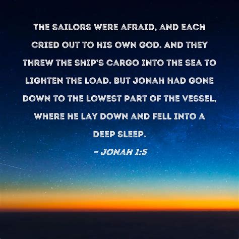 Jonah Chapter 5. And they threw the cargo into the sea to lighten the ship. 5 all the sailors were afraid and each cried out to his own god.