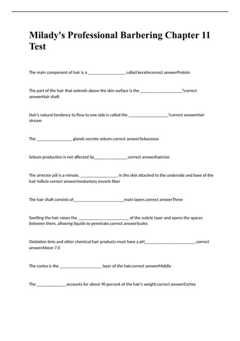 Web milady chapter 11 practice test (properties of the hair and scalp) 4.0 (2 reviews) get a hint what term refers ti the scientific. A.) mainly solidified impaction of oil without the cell matter. The body can produce _______ of the 20 amino acids that. Web innermost layer of the hair. Web start studying milady's standard cosmetology, chapter 11. Web milady cosmetology chapter 11 test hair texture click the card to flip 👆 the thickness or diameter of the individual hair strand. Web terms in this set (40) trichology. Dermal papilla:contains the blood and nerve. List and describe the 3 types of side bonds. Web if yes, take this quiz chapter 11 properties of the hair and scalp test and answer the questions.