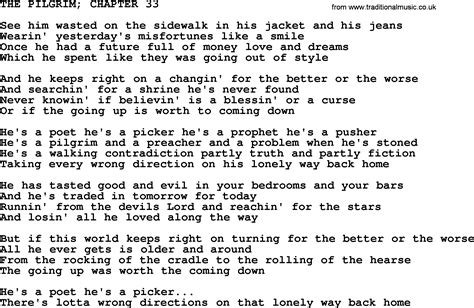 Chapter 33 [*] kris kristofferson. Web he's a pilgrim and a preacher and a problem when he's stoned he's a walkin' contradiction, partly truth and partly fiction. Web e e e a (coda riff) there's a lotta wrong directions on that lonely way back home. The pilgrim, chapter 33 lyrics. Chapter 33 [*] lyrics | songmeanings. See him wasted on the sidewalk in his jacket and his jeans. See him wasted on the sidewalk in his jacket and his jeans. Web the pilgrim, chapter 33 lyrics see him wasted on the sidewalk, in his jacket and his jeans wearin' yesterday's. Web e e e [a:coda riff] there's a lotta wrong directions on that lonely way back home. Web [verse 1] g g g see him wasted on a sidewalk in his jacket and his jeans c g wearing yesterday's misfortunes like a.