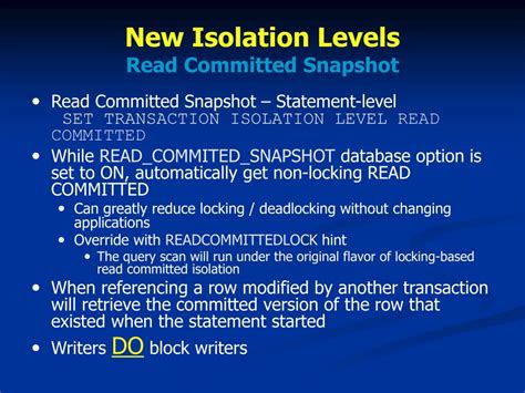 I believe this will give us something closer to oracle where if one transaction is updating other transactions can still read. Posted on june 1, 2010 by david levy. Web i wanted to mention, since i wasn't sure: Alter database databasename set read_committed_snapshot on alter database databasename set allow_snapshot_isolation on. Alter database mydatabase set allow_snapshot_isolation on alter database mydatabase set read_committed_snapshot. You can have allow_snapshot_isolation off and still benefit from read_committed_snapshot. I believe this will give us something closer to oracle where if one transaction is updating other transactions can still read. Web read committed snapshot does optimistic reads and pessimistic writes. Blackboard recommends setting read_committed_snapshot to on for the bblearn (legacy: Microsoft recommends read committed snapshot for most apps that need row versioning. Alter database set read_committed_snapshot on go alter database set allow_snapshot_isolation.</p>
