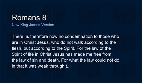 Romans Chapter 8 King James Version. Rom 8:1 there is therefore now no condemnation to them which are in christ jesus, who walk not after the flesh, but after the spirit. 2 for the law of the spirit of life has set you free in christ jesus from the law of sin and death.